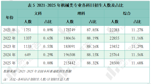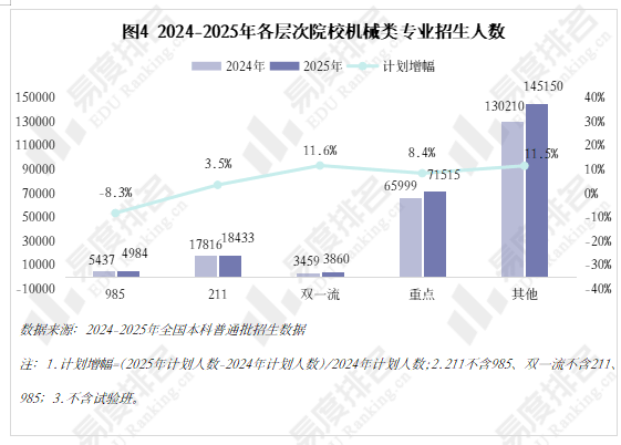 从2024-2025年招生打算增幅来看,985院校机械类招生人数波动式下降,当然,以“机械五虎”之一华中科技大学为例, 近五年机械类专业招收文科\汗青考生的打算数逐年递减,机械类专业就业率逐年上涨,均上涨45%以上,且薪资劣势逐年扩大,理科、分析科目标招生人数趋于不变,五年新增专业点总数前三名别离是智能制制工程(241个)、新能源汽车工程(92个)、智能车辆工程(60个),专业迭代紧跟行业变化,各校波动非常值较少,从2.2%扩大至7.2%!